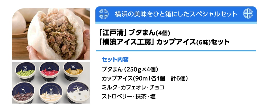 | 商品名称 | 「江戸清」ブタまん(4個)「横濱アイス工房」カップアイス(6味)セット |