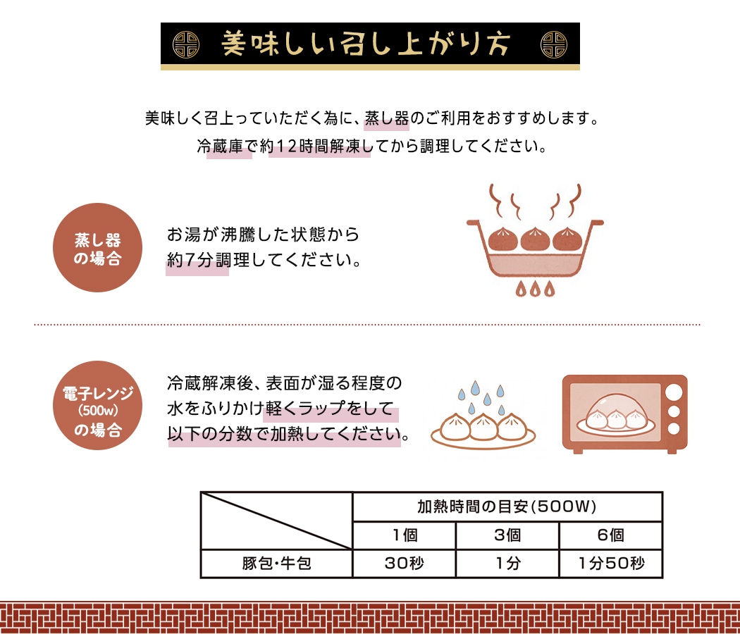 *冷蔵庫で約12時間解凍してから調理してください。 ●蒸し器の場合:冷蔵解凍後、お湯が沸騰した状態から約7分蒸してください。 |