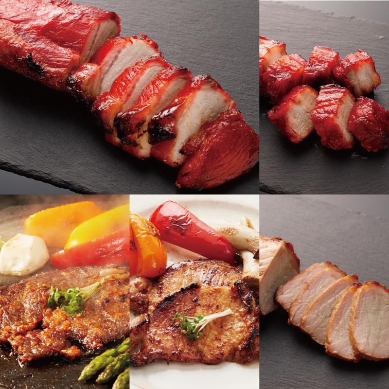 秘伝のタレに漬け込んで専用窯で焼き上げた焼豚3種と中国料理人伝授の中華風味噌漬け肉2種。肉づくしセットです。